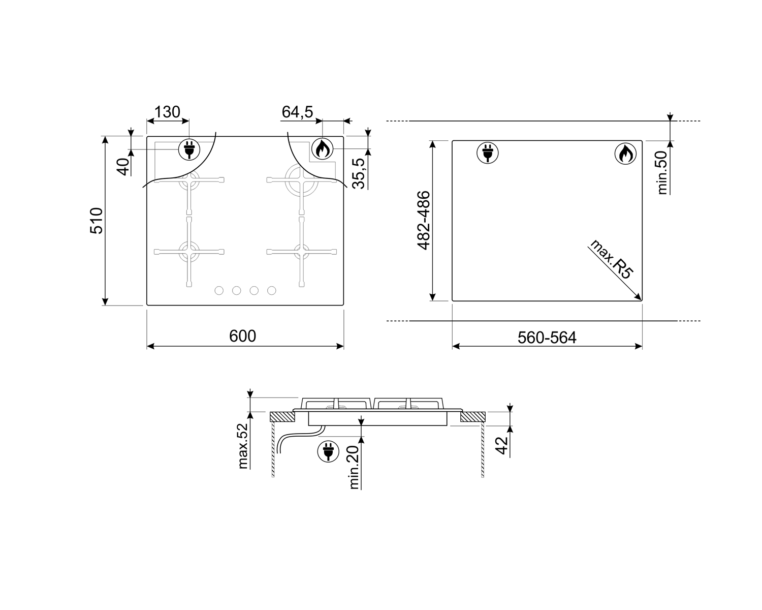 פרופיל התקנה נמוך במיוחד, גימור זכוכית, 4 מבערי אלומיניום